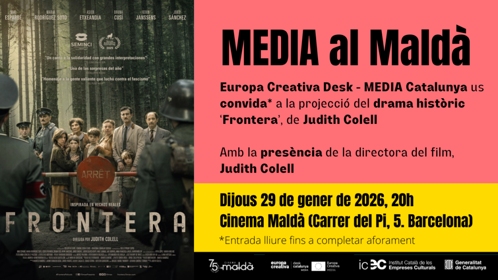 El proper dijous 29 de gener, des d’Europa Creativa Desk – MEDIA Catalunya i en el marc de la quarta sessió de la quarta temporada del cicle ‘MEDIA al Maldà‘, us convidem a la projecció del drama històric amb suport d’Europa Creativa MEDIA ‘Frontera‘, de Judith Colell, al Cinema Maldà de Barcelona.
