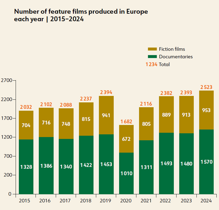 La producció cinematogràfica europea va assolir un rècord el 2024: es van produir 2.523 llargmetratges (a través de 36 mercats).