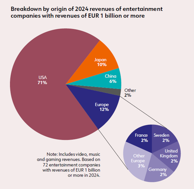 Tot i comptar amb una indústria dinàmica, Europa representa només el 12% dels ingressos de les empreses d’entreteniment més grans del món, molt per darrere dels Estats Units, que domina el mercat global. Mentrestant, importants plataformes globals com Netflix, YouTube i Meta es troben entre els principals agents audiovisuals que operen a Europa.
