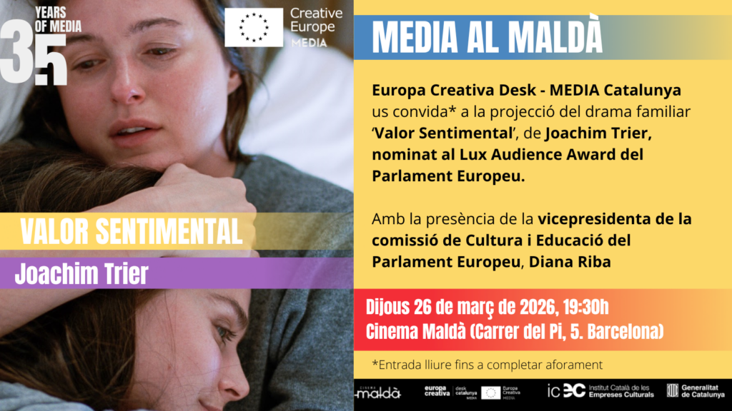 El proper dijous 26 de març, des d’Europa Creativa Desk – MEDIA Catalunya i en el marc de la setena sessió de la quarta temporada del cicle ‘MEDIA al Maldà‘, us convidem a la projecció del drama familiar amb suport d’Europa Creativa MEDIA ‘Sentimental Value‘ (‘Valor Sentimental‘), de Joachim Trier, al Cinema Maldà de Barcelona.