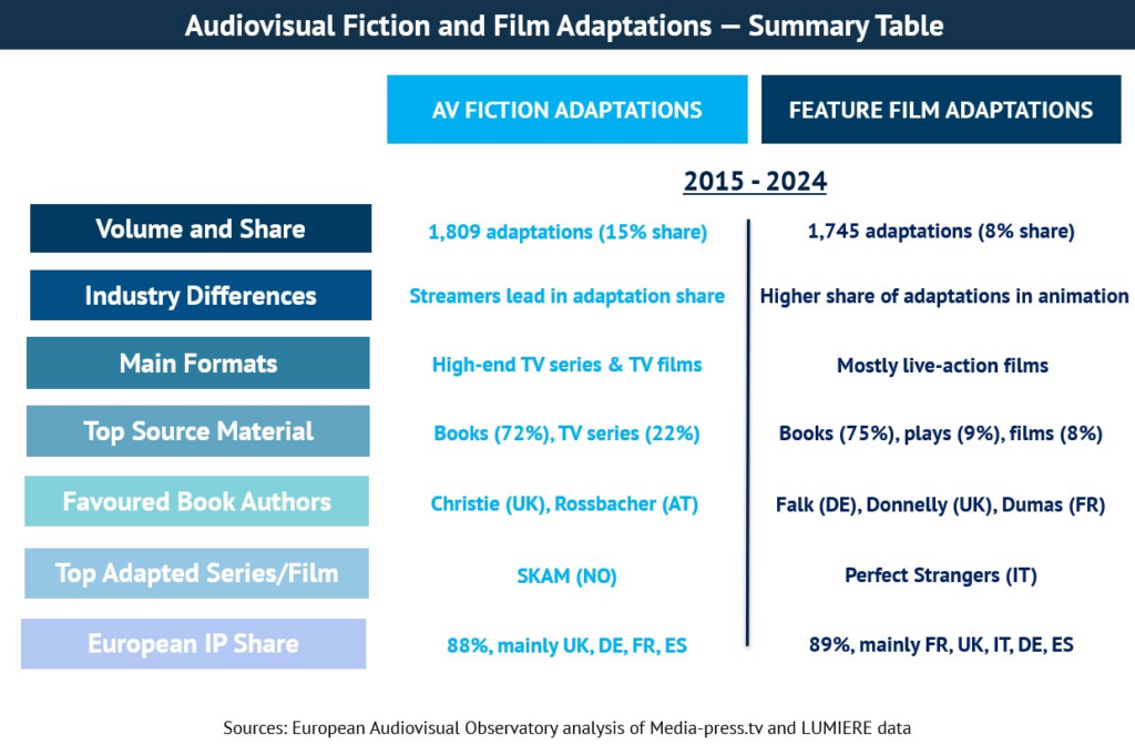 - Les adaptacions de ficció televisiva representen un pilar sòlid de la indústria, tot representant el 15% de tota la producció audiovisual entre el 2015 i el 2024. En canvi, les adaptacions de llargmetratges experimenten una tendència a la baixa, tot representant una quota mitjana significativament menor (només el 8%) de les pel·lícules europees estrenades als cinemes.