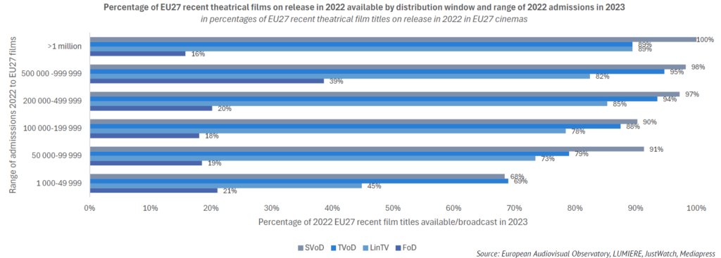 L’Observatori Europeu de l’Audiovisual, que forma part del Consell d’Europa a Estrasburg, ha publicat una nova edició de l’anàlisi de les pel·lícules de cinema distribuïdes per televisió i vídeo a la carta a la UE. Segons es desprèn de l’informe, elaborat amb el suport d’Europa Creativa MEDIA, el 84% de totes les pel·lícules estrenades als cinemes europeus el 2022 es van poder trobar a la televisió i/o al vídeo a la carta el 2023.